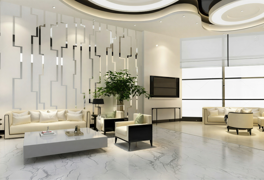 Un fini distinctif aux effets de profondeur et de mouvement. Le revêtement métallisé marbré transforme chaque espace en une pièce unique, alliant luxe et sophistication contemporaine.